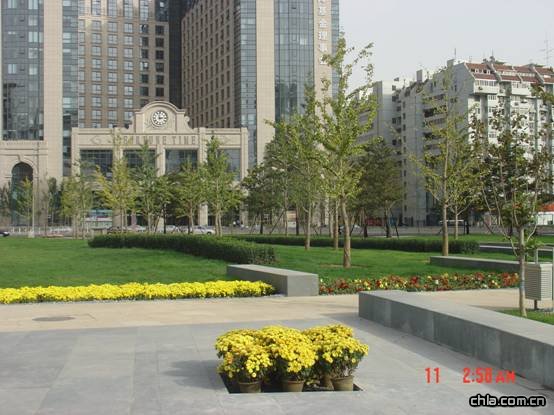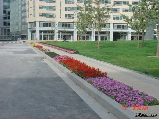 鮮艷的花卉鑲嵌在碧綠的草坪上,為金融街曾添另一番景象