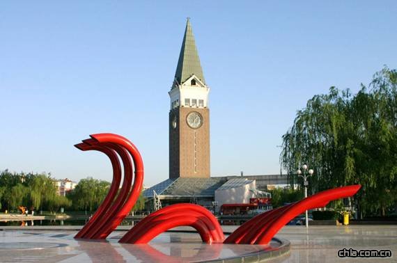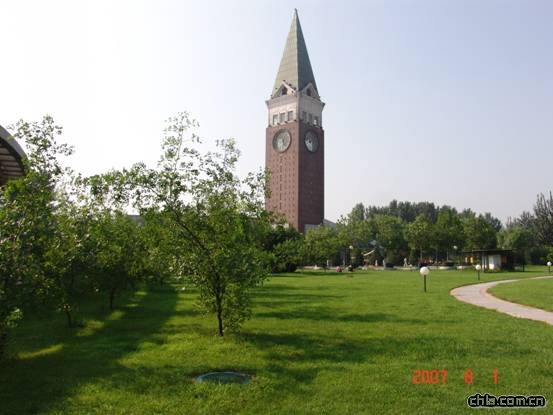 從回龍苑東南門入口噴泉廣場看千禧塔  建筑與雕塑的緊密結合也是古典與現代的完美融合