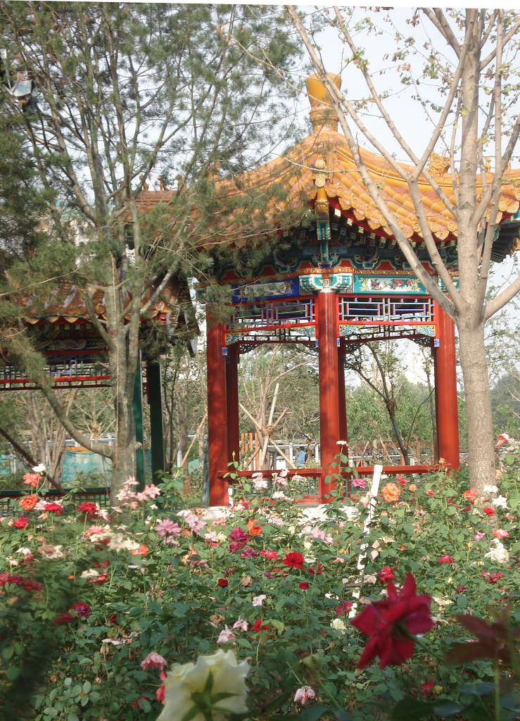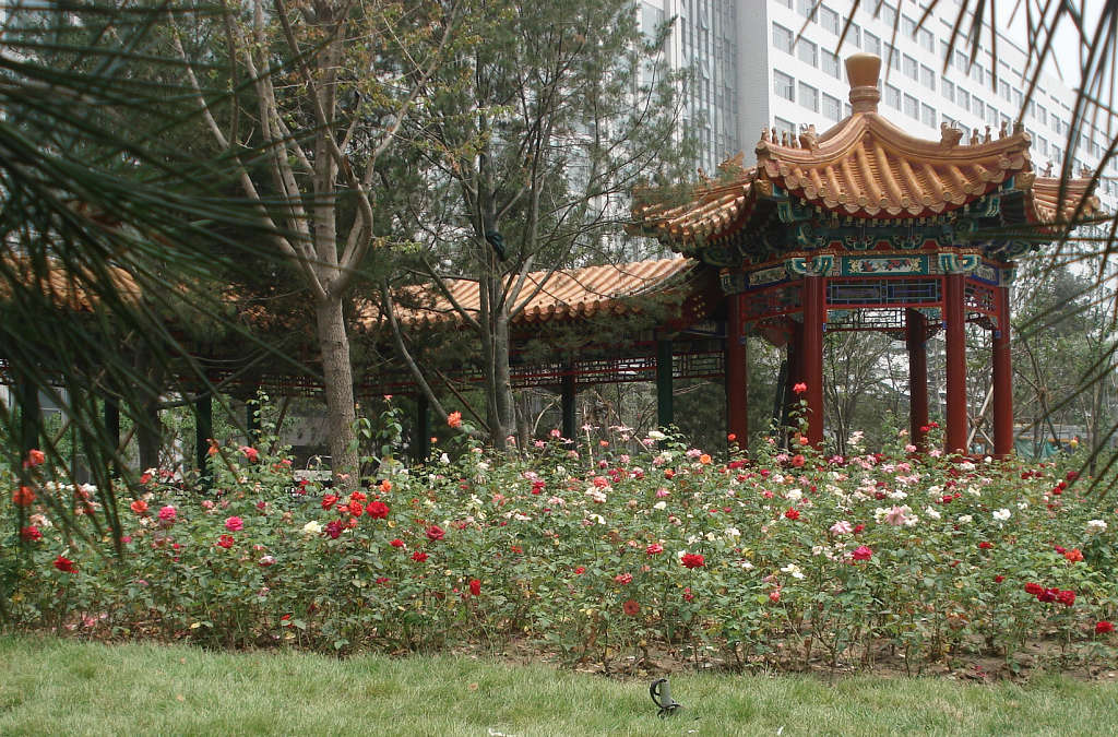 白皮松與游廊相稱, 品種月季爭奇斗艷,芳香怡人