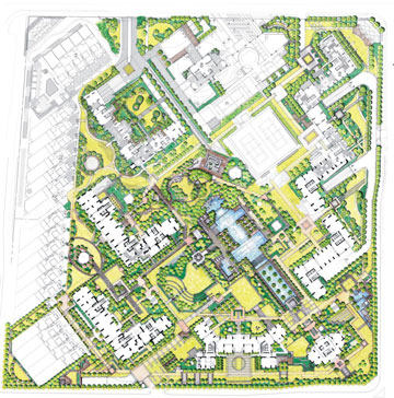 紅樹灣擁有清晰而分明的規劃,是現代的景觀設計手法運用的源泉,景觀依此極富肌理地生長。奧雅讓社區擁有大尺度的園林體驗,恢復和挖掘“紅樹灣”本身名稱中代表的良好生態環境意義,在社區內設置人工湖,在湖邊抽象再現了紅樹生長、鳥類棲息所需要的濕地。沿南北兩邊長達300米的景觀軸線,頗具形態的長綠樹種形成了綠色走廊,空間自然地得到了延伸和統一。 整個園區延續自然淡雅的空間感受,追求高品位的審美意趣,堅持清晰明朗的軟景設計。將大樹、灌木、地形等各要素分層次組合,使各部位都能表達自身純粹的美感。同時關注林下層次的設計,迎合嶺南地區氣候對植物群落的影響。通過對這10萬平方米的現代嶺南風格園林進行改造和提升。 1、總平面圖