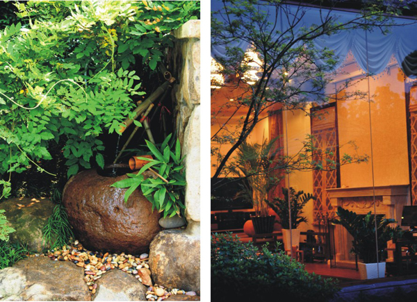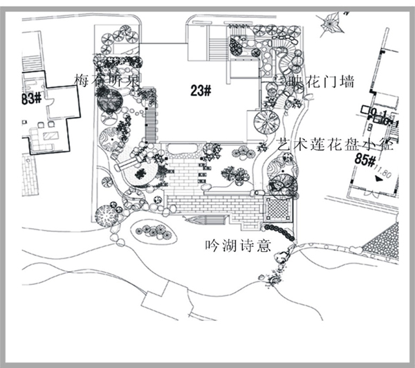 2.庭院構思與立意 在現代住區規劃的組團綠地布局中,局部營造出新古典風格的庭院,雖有先例,但無常規。特別是空間層次的組織及使用功能都不相同,不能生搬傳統造園的手法,只能因地制宜的利用現狀條件,從空間尺度上準確的把握比例。反復調整空間組合、植物配置、小品細部設計。即有傳統風格“移步景異”的美妙感受,又具備現代生活所需的功能性。 2.1相地與布局 業主對傳統文化的喜愛和體驗,為此設計中充分強調了庭院風水的重要性。 在構成庭院風水的元素中,水是最重要的環節之一。無論是滋養生命、提升活力,還是招引財氣、啟迪智慧,水的作用都是不可替代的。《黃帝宅經》指出,宅以泉水為血脈。因此,完美的庭院里都必須有水體畫龍點睛。