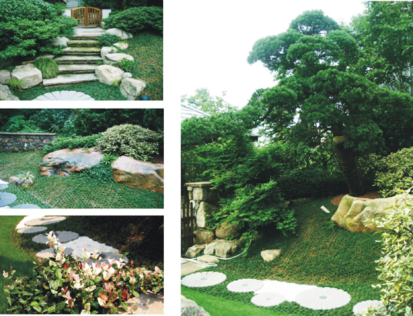 4.3斑葉植物 斑葉植物在庭院中種植有新奇的效果,富有感染力。是此庭院地被中的一大亮點。墻隅。景石縫間的花葉絡石。用做孤植的花葉胡禿子。植于水邊的花葉美人蕉,花葉蘆竹等等,與其他喬灌木、地被、草坪合理配置的金葉絡石,大大提高了庭院的觀賞價值。豐富了綠地景觀的觀賞性。 斑葉植物在全照的的條件下才能充分體現出色彩美,光照越強,葉片色彩越鮮艷豐富。 5. 結束語 蘇黎士小鎮私家庭院的設計及實現都是力求對傳統園林做一種當代的解讀,不只是對傳統園林的簡單模擬和抄襲,而是繼承了對傳統園林山水布局、建筑經營、花木配置、置石疊山的手法,在此基礎上有所吸收和簡化,有所創新,是一種理念的繼承及突破。