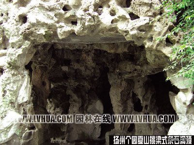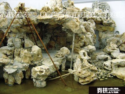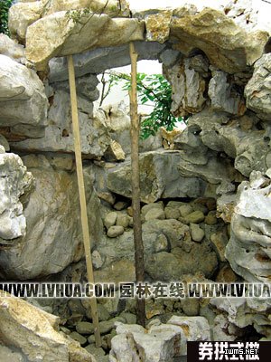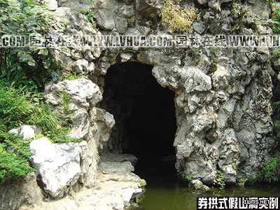 關于假山洞,《園冶》說:“理洞法,起腳如造屋,立幾柱著實,掇玲瓏如窗門透亮,及理上,見前理巖法,合湊收頂,加條石替之,斯千古不朽也。”說明古代假山山洞的一般結構都是梁柱式的。假山山洞的洞壁是山洞的支架,它由柱和墻兩部分組成,在平面上,柱是點,墻是線,而洞就是面。古代不少梁柱式的假山洞采用花崗巖條石為梁,或間有“鐵扁擔”加固,這種方法即便用石加以裝飾,但洞頂和洞壁之間還是很難融為一體,缺乏自然。另一種則采用“疊澀”的方法,用山石向山洞內側逐漸挑伸,至洞頂再用自然山石為梁壓蓋,這種方法也稱為“挑梁式”,其兩端的搭接部分,每端應在15厘米以上。還有一種就是清代乾嘉年間戈裕良所創造的券拱式的假山洞頂結構,錢泳在《履園叢話》中說:“近時有戈裕良者,常州人……。嘗論獅子林石洞皆界以條石,不算名手,余詰之曰:‘不用條石,易于傾頹奈何?’戈曰:‘只將大小石鉤帶聯絡,如造環橋法,可以千年不壞。要如真山一般,然而方稱能事。’余始服其言。”由于這種券拱式結構的承重是逐漸沿券成環拱擠壓傳遞,所以不會出現如梁柱式石梁的壓裂、壓斷的危險,而且能頂壁一氣,整體感強。同時可在其中心部位夾掛懸石,以產生鐘乳石垂掛的效果。其施工時,中間應搭建支撐架。