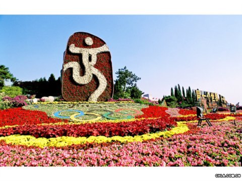 一是花壇主題明確,構思巧妙,設計新穎。今年廣場花壇是第三年采用中心噴泉花壇及東西兩側"畫卷"的形式,設計整體方案通過幾年來的不斷總結,為達到最佳的景觀效果,有了新的嘗試。中心花壇題為"萬眾一心",主噴泉高25米,有20多種水型變化,噴泉外側中國結造型花壇點綴。東側花壇題為"海納百川萬眾一心共圓奧運夢",從北向南依次為2008北京奧運會會徽"中國印"-奧運口號"同一個世界,同一個夢想"及五球的造型。西側花壇題為"天高云淡山青水碧和諧九州風",從北向南為典型民居、風能利用和現代都市為主景。今年的設計效果用設計人員的話來說是"相對完美"的一年,完美在主題明確:眾人矚目的"奧運"和民心所向的"和諧社會"主題清晰;完美在貼近生活:以世界文化遺產安徽宏村為設計原型的民居造型、風力發電風車造型和體現現代都市的花樓,城市與農村與大自然的完美結合,勾勒出一幅國泰民安、欣欣向榮、生機盎然的美麗圖畫。