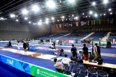 擊劍比賽的正式比賽將在國家會議中心主體項目南側的四層舉行,包括地下空間一層,地上空間五層,建筑面積約5.6萬平方米。其中地下一層為安保用房、場館運行用房及機房。地上一層為擊劍訓練館,設有14條劍道,可容納觀眾約1800人。賽時管理用房位于會議中心的二層,環繞在訓練館的四周。三層北側為擊劍館的熱身場地,擁有熱身劍道12條,同時設有運動員的休息及淋浴用房。南側則是用于電視轉播的功能用房。,面積約7000平米,設有劍道5條,可容納觀眾近6000人。同時還將承擔奧運會現代五項比賽中的擊劍和氣手槍兩個項目。屆時4層大廳將被改造成擁有10條比賽劍道和38個氣手槍靶位的比賽場地,可容納觀眾約4000余人。