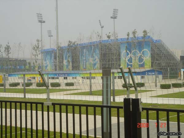 五棵松棒球場由三塊場地組成,“好運北京”國際棒球邀請賽的大部分賽事將被安排在2號比賽場進行。2號比賽場的北側是本次邀請賽駐場館團隊的辦公樓。說是辦公樓,實為簡易的兩層活動房屋,這節約了成本,體現了“節儉辦奧運”的觀念。