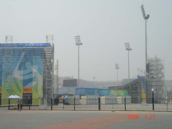 五棵體育中心--棒球場,能看到高高的球場燈柱和一排排臨時搭建可拆卸的座位