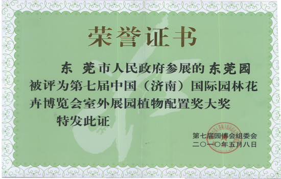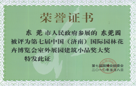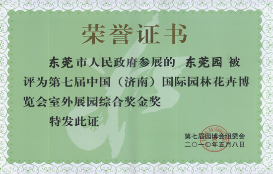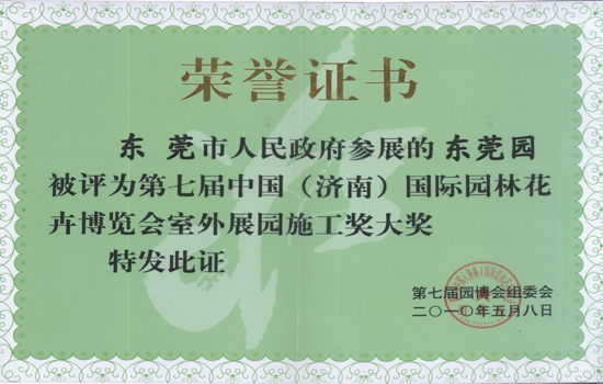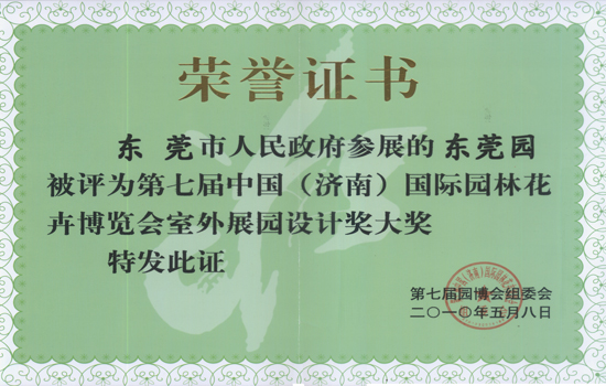 東莞首次參加園博會,即取得了不俗的成績:東莞市政府被住建部授予優秀組織獎,東莞市嶺南園林建設有限公司榮膺先進集體獎;在108個室外展園的角逐中,“莞香園”展區榮獲綜合類金獎,并在設計類、施工類、植物配置類和建筑小品類的評比中均獲得大獎,受到建設部及組委會及眾多領導、專家的高度贊揚。“莞香園”濃郁的嶺南特色,精湛的藝術水平,展示了一流的設計及施工水平,深受廣大游客青睞。據悉,自園博會開幕以來,已共有100多萬人次參觀“莞香園”,使國內外更多的城市和群眾進一步認識了東莞,為莞爭了光。