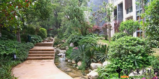 以植物造景為主,夏季開花的荷花、合歡、紫薇及常綠的庭蔭樹香樟為主景植物。主干道為景觀留出了視線通道,居民可以在組團內近觀夏語芳菲,遠借東湖煙霞。