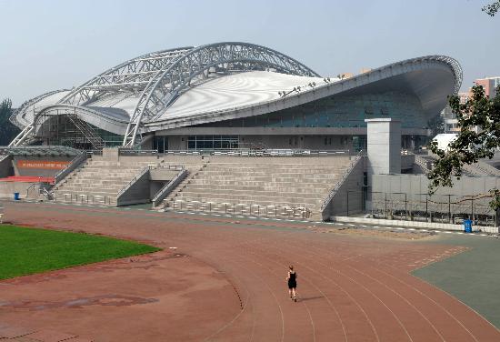走進北京理工大學,來到中心教學樓,向西,波浪般起伏的雙曲流線屋頂的體育館就呈現在記者面前。懸吊在兩道巨型弧梁之下,體育館波浪般的屋頂極像一條飄逸的鰩魚,動感十足,充滿著朝氣與活力。這座體育館就將是北京奧運會排球比賽預賽場館和殘奧會盲人比賽的場館。