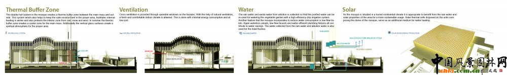 清真寺位于雨水充沛陽光充足的大陸性氣候,可更好的對能源進(jìn)行可持續(xù)利用。清真寺穹頂上的太陽能板是加熱水的又一途徑。圖書館,湯廚房,演講廳上的屋頂綠化也發(fā)揮了對建筑物的保溫作用,同時改善了空氣質(zhì)量,從而降低了城市空氣溫度,抑制了熱導(dǎo)效應(yīng)。