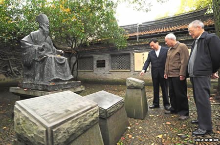 在寧波市天一閣藏書樓創(chuàng)始人范欽石雕像前,中國科學(xué)院院士戚正武(右一)、中國工程院院士郁銘芳(右二)等人在閱讀碑文。