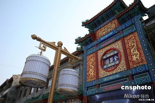 沿著前門大街的北口進入,街道兩側的52棟單體建筑基本完成了外部施工,一些建筑還安裝上了落地的大玻璃窗,工人正在進進出出進行緊張的內部裝修。大紅的糖葫蘆、大小不一的撥浪鼓、黃銅的鳥籠,三個老北京小吃和耍貨,如今變成了現代的照明器材矗立在大街兩側。從北往南依次安裝的是8盞故宮宮廷式樣的園林燈,38架鳥籠燈,56個撥浪鼓路燈以及24個每串有八個大山楂的糖葫蘆路燈。街道兩側,全聚德、中國書店、中國郵政、寶興、義昌源、廣和樓、中和戲院幾家商鋪、戲院和老字號的招牌已經高高掛起,但從外表上卻依然沒有見到如星巴克等現代商業進駐的跡象。
