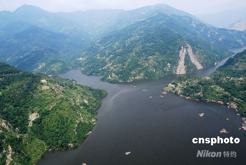 資料圖:四川北川,泄洪前的唐家山堰塞湖。唐家山堰塞湖是汶川大地震形成的。