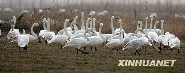 1月4日,一群白天鵝在山西平陸黃河濕地棲息。新華社發(薛俊 攝)