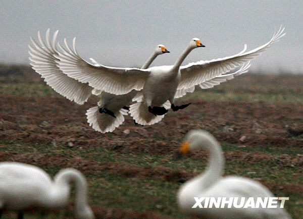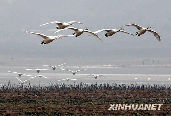 1月4日在山西平陸黃河濕地拍攝的白天鵝。 新華社發(薛俊 攝)