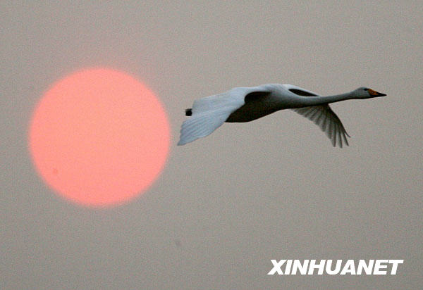1月4日,一群白天鵝在山西平陸黃河濕地上空飛翔。 平陸黃河濕地是我國白天鵝越冬棲息地之一,當地建起白天鵝保護站,指定專人巡護并定點、定時投食,保護遷徙至平陸濕地的白天鵝安全過冬,成群結隊的白天鵝成為平陸黃河濕地壯觀獨特的景觀。 新華社發(薛俊 攝)