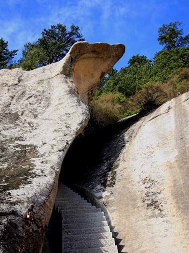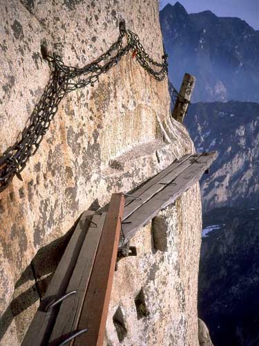 在升表臺西側,穿過石門樓,便是華山最險之景——長空棧道。此道開鑿在南峰腰間,上下皆懸崖絕壁,鐵索橫懸,由條石搭極窄的路面,下由石樁固定。由于棧道險峻,所以當地人有這樣的說法“小心小心九厘三分,要尋尸首,洛南商州”。這里并非登山者的必經之路。所以,石壁上刻有不少警告之語,如:“懸崖勒馬”、“云開溢蕩”等。