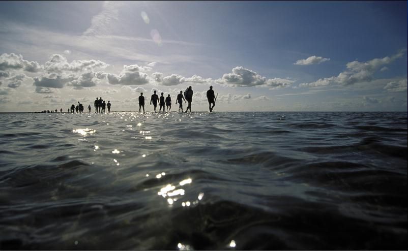 瓦登海,丹麥。瓦登海是上一次冰河時代形成的低洼淺海區。游客們蜂擁而至,體驗“海上行走”的感覺。瓦登海地區的地表不斷由海水和風力塑造然后破壞,形成新的沉積物。但是如果海平面上升的速度超過預期,將缺乏足夠的沉積物來重塑陸地。