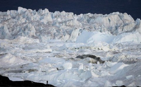 格陵蘭島,伊路莉薩特冰灣。巨大的冰層從雅各布冰川(Jakobshavn)中崩裂分離。伊路莉薩特冰灣(Ilulissat Icefjord),從伊路莉薩特鎮延伸37英里一直到格陵蘭島冰川,被公認為是世界上最漂亮和最讓人難忘的地方之一。這里也是全球氣溫升高最快的地方,從1992年到現在,冰川已經融化后退了4.3英里。如果格陵蘭島的冰川全部融化,那么世界海洋洋面將會上升24英尺。