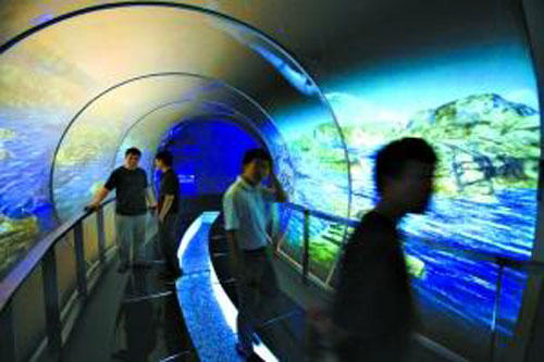 一走進(jìn)大廳,看到的是五座玻璃墻“巖石柱”,里面盡是各種各樣的巖石塊,原來這里展示的是公園地質(zhì)的五個時代,當(dāng)然,對小孩子來說,地史演化廳更加吸引人,深藍(lán)色的浩瀚宇宙,長長的時空隧道,通過光影等高科技手段,領(lǐng)略地球的形成歷史,并感受從一片洪荒世界到人類文明的發(fā)展過程。