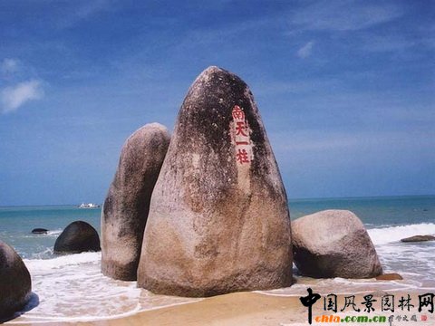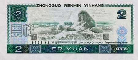南天一柱位于海南島南部海岸的“天涯海角”風景區里。從這里向南就是茫茫大海,古人認為是中國的最南端,于是有“天涯海角”之稱。相傳這里的一塊2米高的巨石曾是支撐天空的柱子的一部分,在共工撞不周山時碎掉了,清代官員范云梯在巨石上寫下“南天一柱”四個大字。錢幣上的圖案做了藝術處理--讓巨石屹立在大浪之中,顯得雄渾壯觀,實際上這塊石頭的位置是在沙灘上。科學家說近年氣候變暖海面上升,也許有一天2元人民幣上的圖案會變成現實。