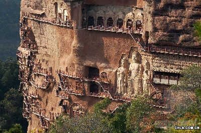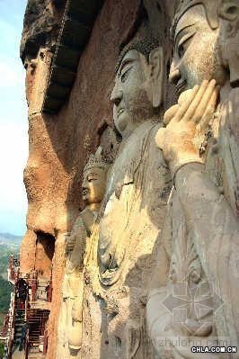麥積山數(shù)百個(gè)石龕中,薈萃著上迄后秦下至清朝的十多個(gè)朝代的各種塑像。