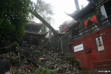 走進二王廟古建筑群,曾經站在其上將都江堰水利大壩盡收眼底的秦堰樓地基嚴重下沉,殘垣斷壁向水利大壩傾斜,破碎的瓦片、斷裂的塊橫七豎八地躺在山坡上。戲樓、廂房、52級梯步、照壁損毀最為嚴重,特別是書著“二王廟”三個大字的照壁,完全被毀,瓦礫、磚塊、木塊,目光所及,一片廢墟。值得慶幸的是,存放李冰塑像的大殿和存放李冰兒子塑像的二殿雖然有不小的破壞,但塑像本身破壞不大……