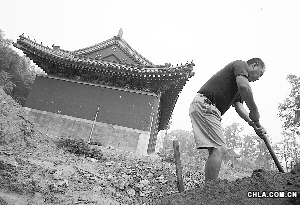 6月27日,工人在準備土料修葺正覺寺的外圍墻。今年圓明園將復建保護長春園宮門和正覺寺。