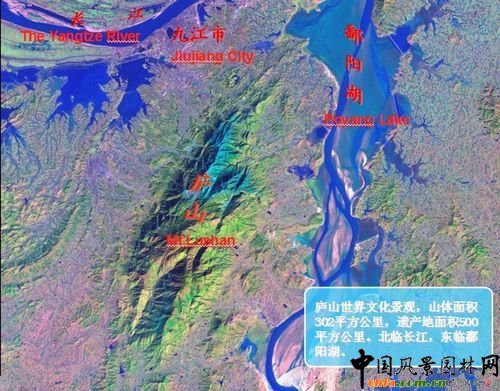 廬山世界文化景觀,山體面積302平方公里,遺產地面積500平方公里。北臨長江,東臨鄱陽湖。