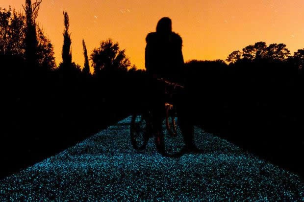 荷蘭埃因霍溫市(Eindhoven)的郊外,有一條600米長(zhǎng)的自行車道。每到夜晚,道路會(huì)變得非常漂亮:成千上萬(wàn)顆小石頭發(fā)著藍(lán)綠色的微光,如同銀河星空灑落人間般往前蜿蜒,在這條路上騎行,有一種置身夢(mèng)境的浪漫。