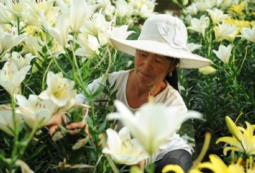 女工在大棚中整理即將出售的百合花(8月20日攝)